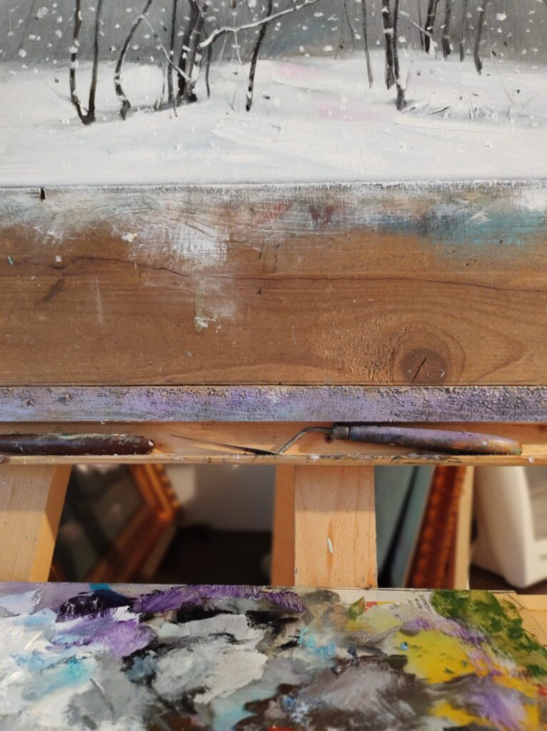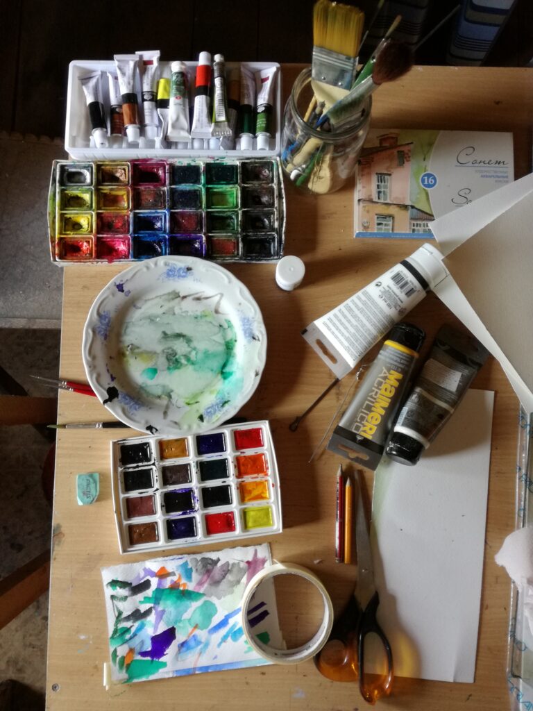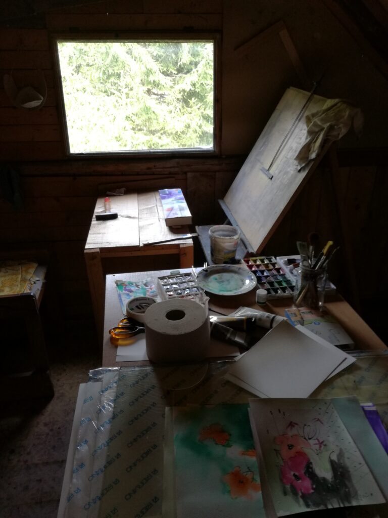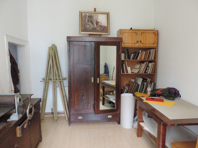 Spațiul era însă cam neîncăpător și lumina naturală prea puțină, așa că am folosit treptat la maxim orice loc, o mulțime de rafturi și mai multe becuri. Apoi, la un moment dat, folosind garajul mai mult ca depozit, Monica a insistat să-l golim să-l punem la punct și să facem un atelier de pictură mai bun. Și a fost bine. Acum aici lucrez în ulei, în pivniță fac toate treburile legate de tablouri și sus în casă lucrez în acuarelă.”