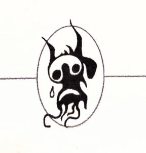 Era pe vremea când eram inginer stagiar la o intreprindere la Turda. Până să-mi găsească o garsonieră directorul (om de treaba) mi-a găsit un mic spaîiu la un preot, prieten de-al lui. S-a nimerit atunci că voiam la un moment dat să fac un mic desen cadou unei fetițe tare drăguțe a unei cunoștinte. Fetiței i-am zis că-i ca un drăcușor. Și m-am gândit că asta ar fi cel mai potrivit sa fac. Un desen cu un drăcușor. Și ca acest drăcușor să nu aibă nimic malefic, din capul locului mi-am zis că ar fi f. bine să lăcrimeze. Și m-am apucat de treabă. Dar spre surprinderea mea, nu reușeam nicicum să obțin o expresie potrivită. Așa că am pregatit o mulțime de coli A4 și dă-i cu tușul negru până în sfârșit am obținut o variantă care m-a mulțumit și am rezolvat problema cu succes. Iar cu celelalte f. multe încercări numai bine am acoperit pereții cămăruței preotului, creîndu-mi un pic de spațiu personal. Când am primit garsoniera de la intrepridere am plecat în grabă de la preot și am lasat desenele pe perete. A doua zi m-a chemat directorul la el in birou și s-a apucat să râdă nestăvilit: cum am putut să-i umplu casa unui preot cu draci pe pereți! Dar, mai târziu, am refăcut dracușorul care lăcrimează și l-am imprimat pe primele mele cărți de vizită ca pictor și l-am pus pe ușa cămăruței din pivniță (demisolul casei socrilor unde am fost primit) în care mi-am amenajat primul atelier de pictură. Deoarece pictam în casă și făceam miros și murdărie, m-am bucurat atât de mult de acest spațiu numai al meu ca atelier, încât imediat am scris cu ce am găsit la îndemână, o bucată de cretă albastră ,pe ușă : Paradisul regăsit. Aici am lucrat cel mai mult timp.
