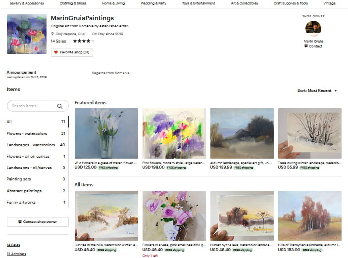 Pentru vânzări în străinătate, vă rog să vizitați magazinul de Etsy Marin Gruia Paintings. Acesta include lucrari neinramate, care pot fi expediate in plic sau tub de carton, rulate.