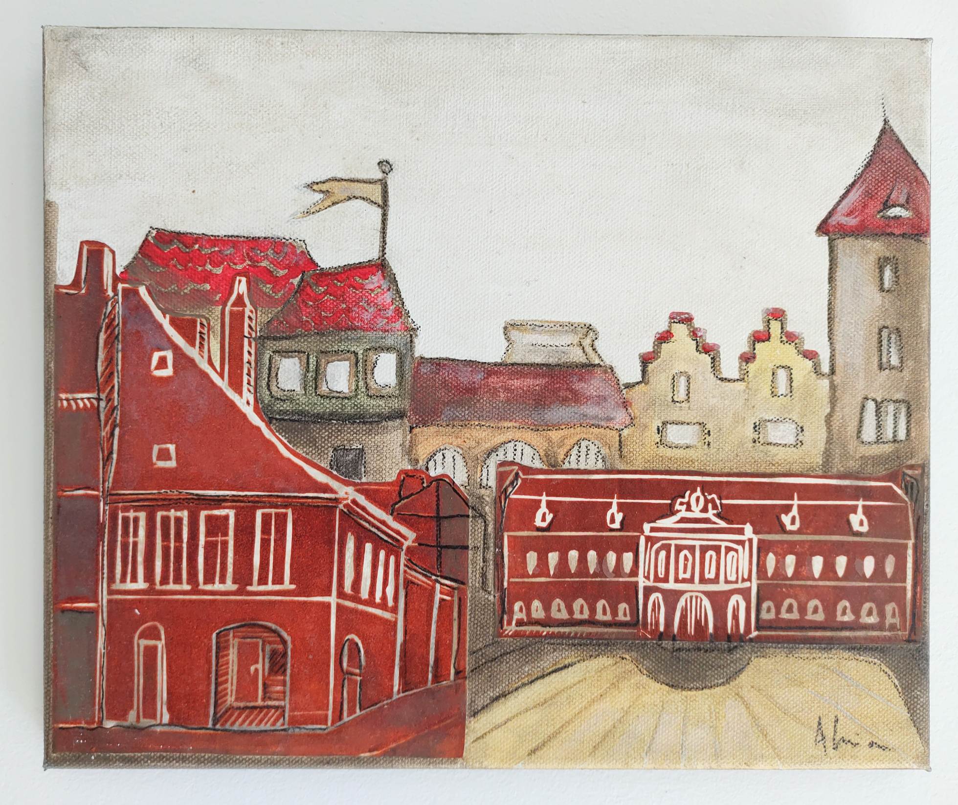 Această piesă unicat îmbină linogravură, pictură în acrilic și creion pe pânză întinsă pe șasiu, surprinzând monumente emblematice și detalii imaginate ale Clujului în nuanțe vibrante de roșu.