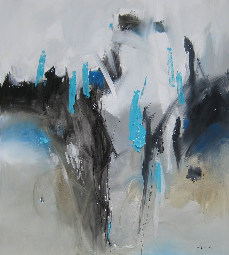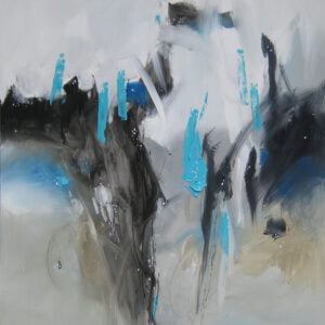 Transformați-vă spațiul cu această compoziție abstractă captivantă, realizată în ulei pe coală de lemn tratat de către Marin Gruia. Tabloul, atipic pentru artistul specializat în flori și peisaje, impresionează prin tușele sale pline de dinamism și nuanțele subtile de alb, negru și turcoaz.