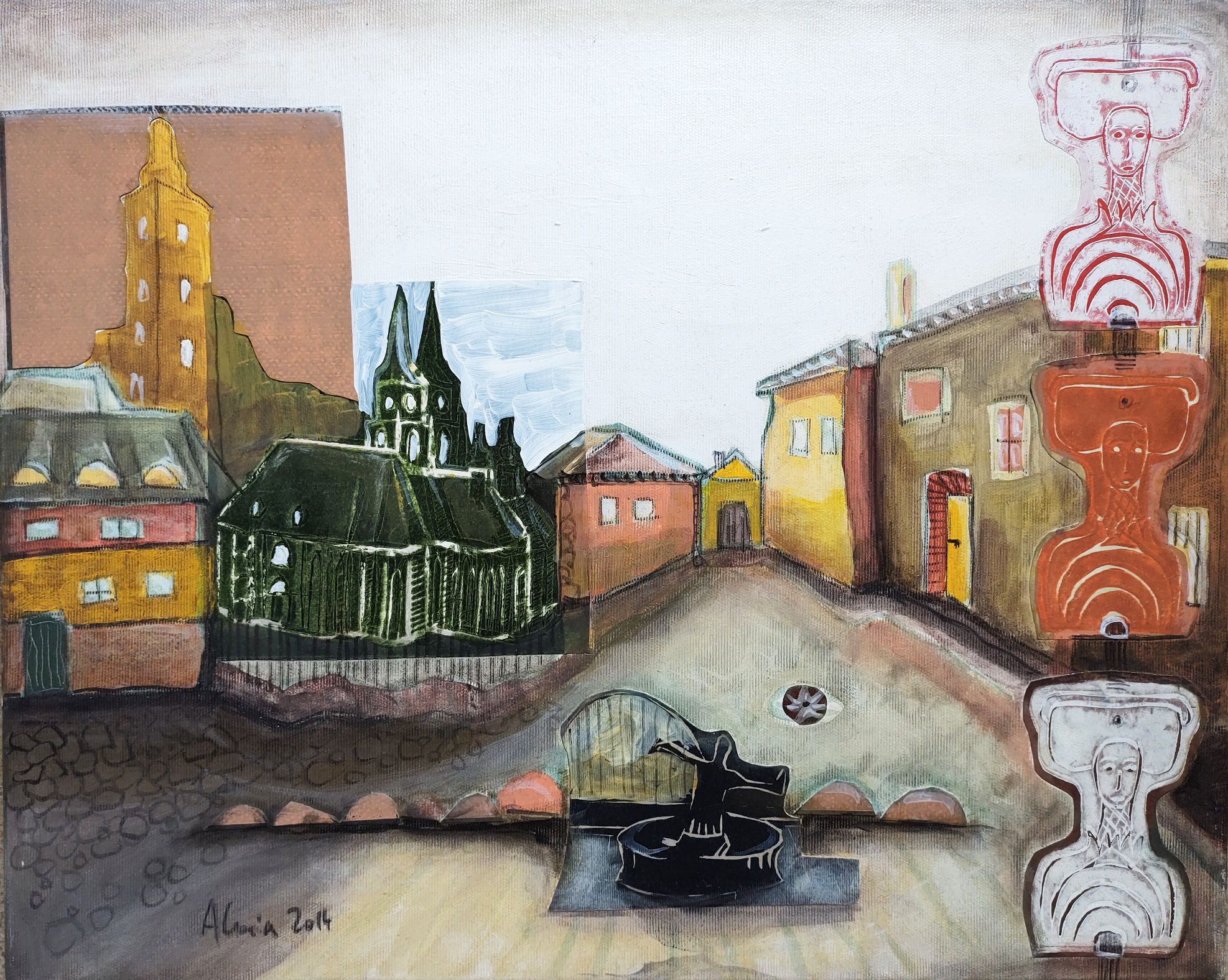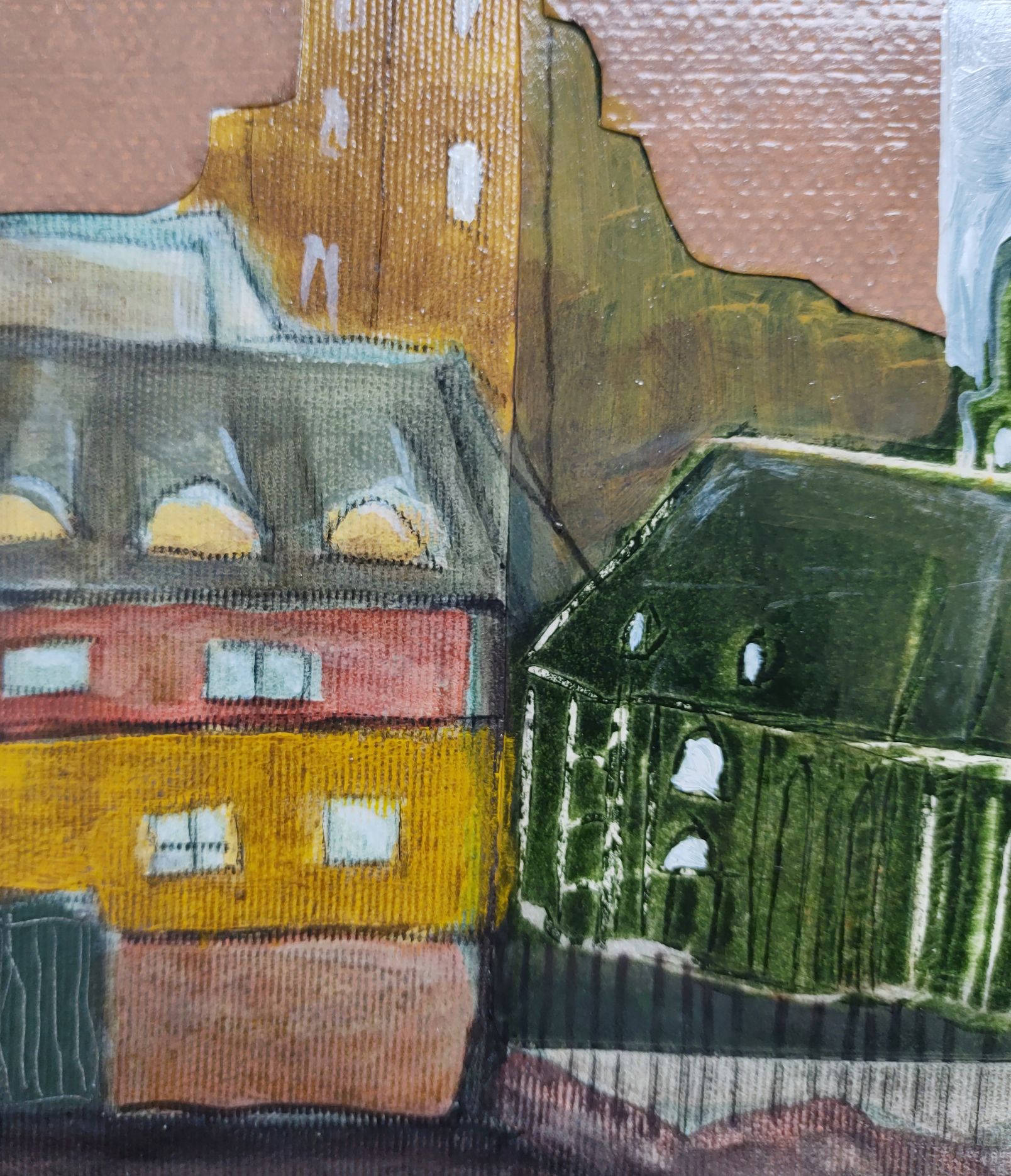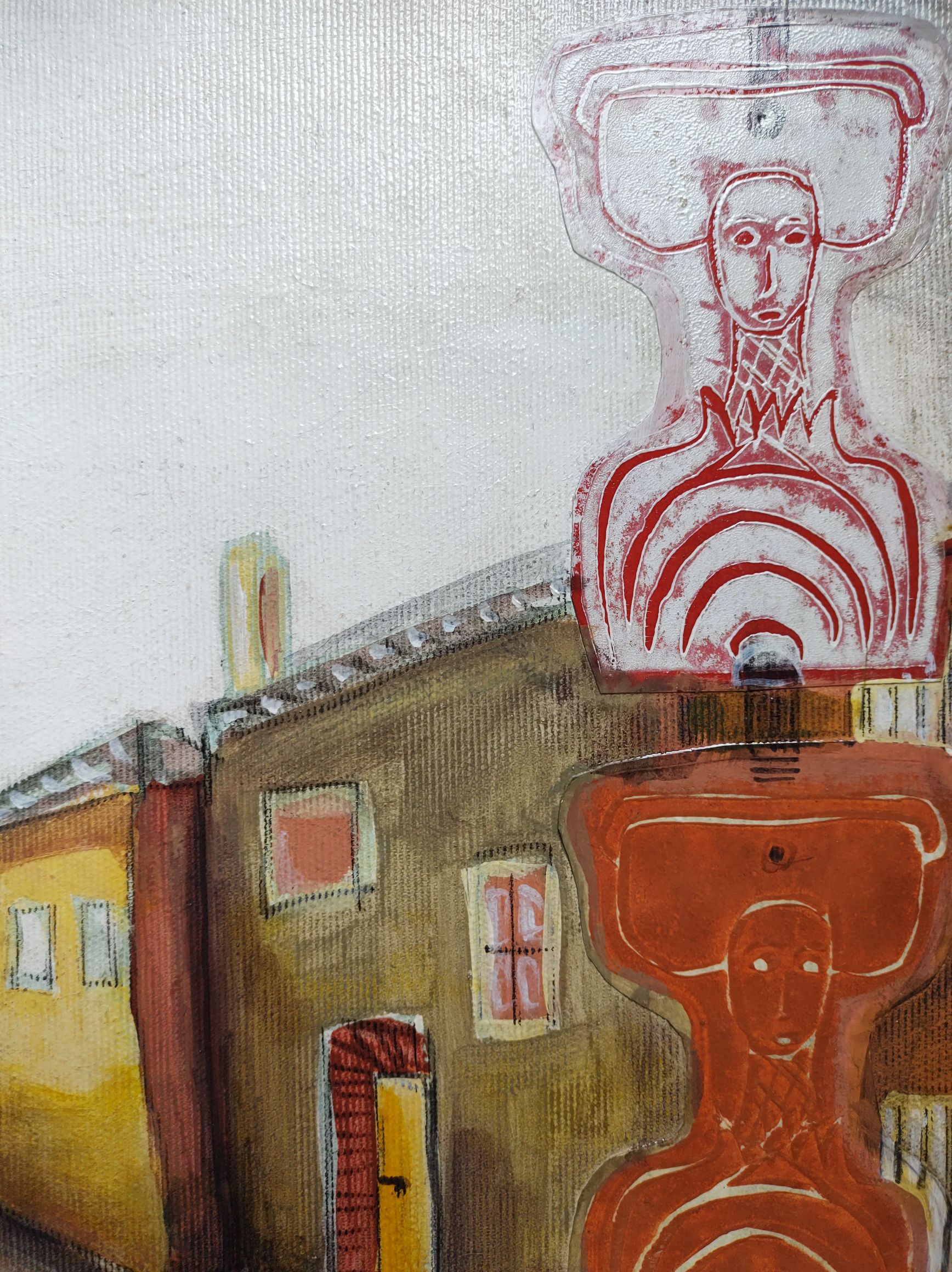 Bucură-te de o experiență artistică captivantă cu acest tablou realizat în tehnică mixtă (colaj, linogravură, pictură în vopsele acrilice pe pânză întinsă pe șasiu). Fiecare strat al acestei lucrări este o îmbinare armonioasă de tehnici și idei, oferind o poveste vizuală plină de profunzime și culoare.